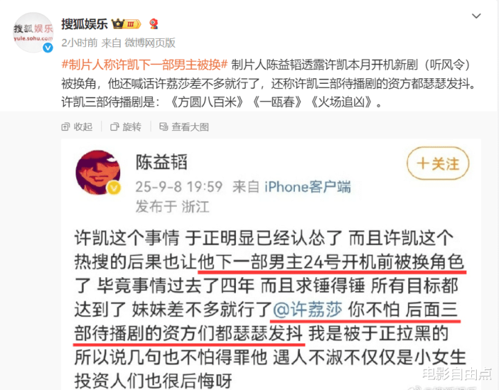 这也是于正竭力维护许凯的主因——旗下重点演员若塌房,数部投资作品将血本无归。