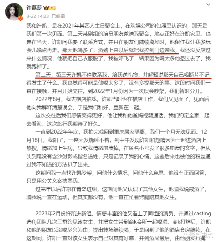 整起事件始于8月22日,许荔莎首次公开与许凯的恋情。她透露2021年末公司在年会上相识,次日许凯便邀请她到家中聚会,并借酒劲强行亲吻。